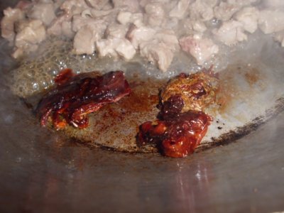 Empieza a dorar la carne en el aceite y el laurel, echa el tomate seco a la sartén y frielo un poco, sácalo y reservalo para el majao.