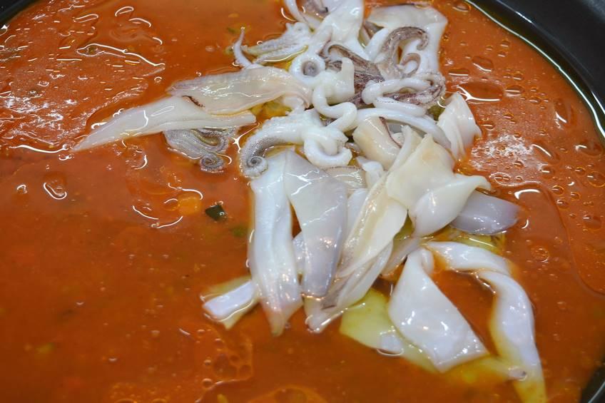 Paso 2 Con los calamares cocinados, ponemos los mejillones, sin cáscara, los guisantes y los langostinos pelados. Dejamos que se cocinen durante unos 5 minutos.