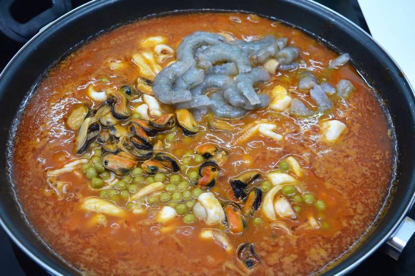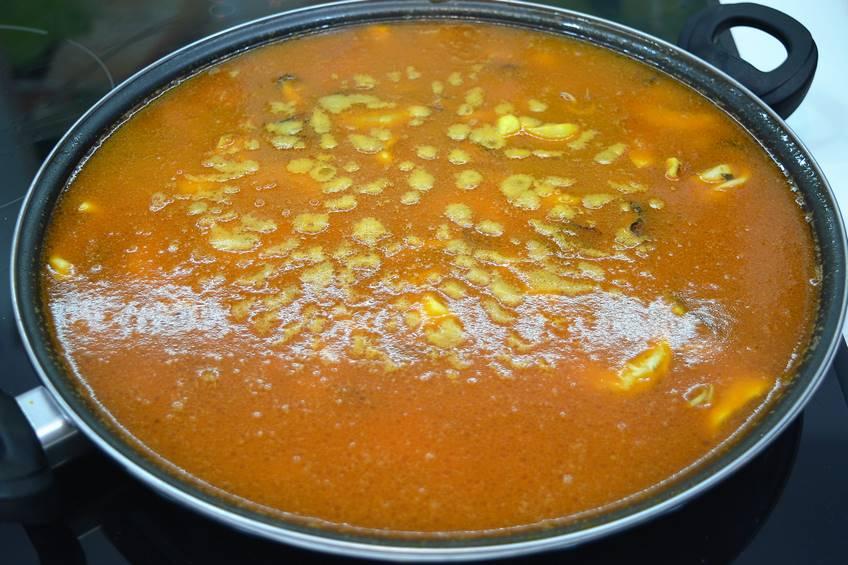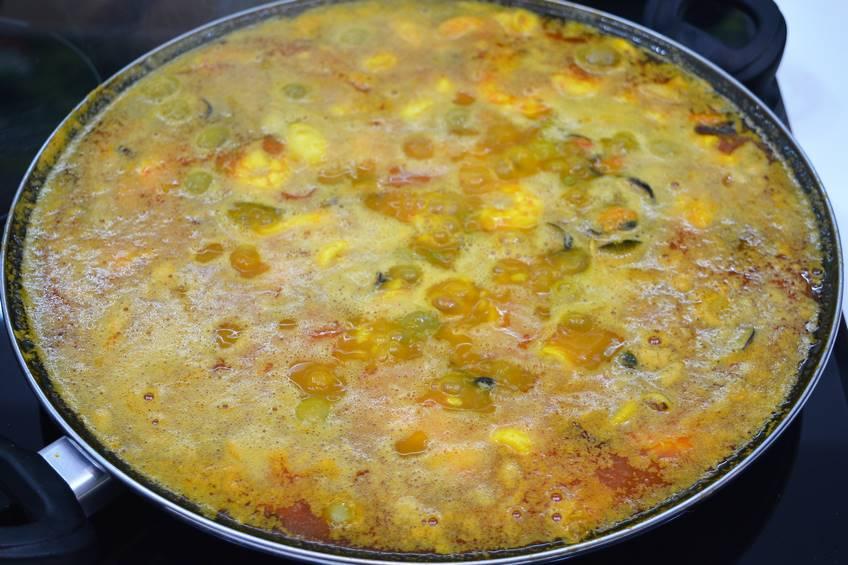 Caldo de pescado (el doble de caldo que de arroz en volumen)Arroz con marisco, preparación: