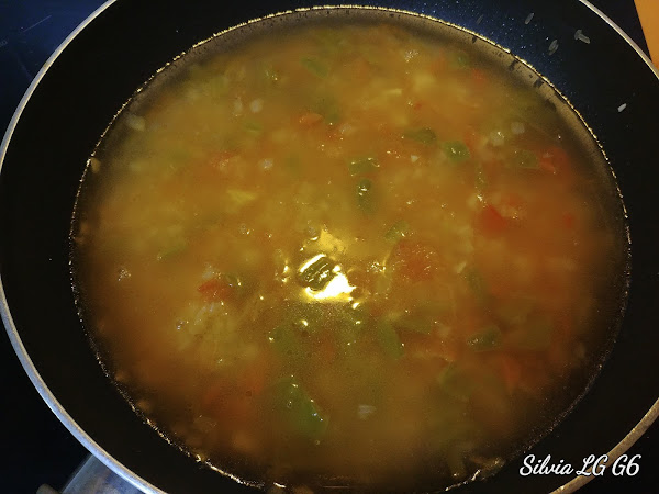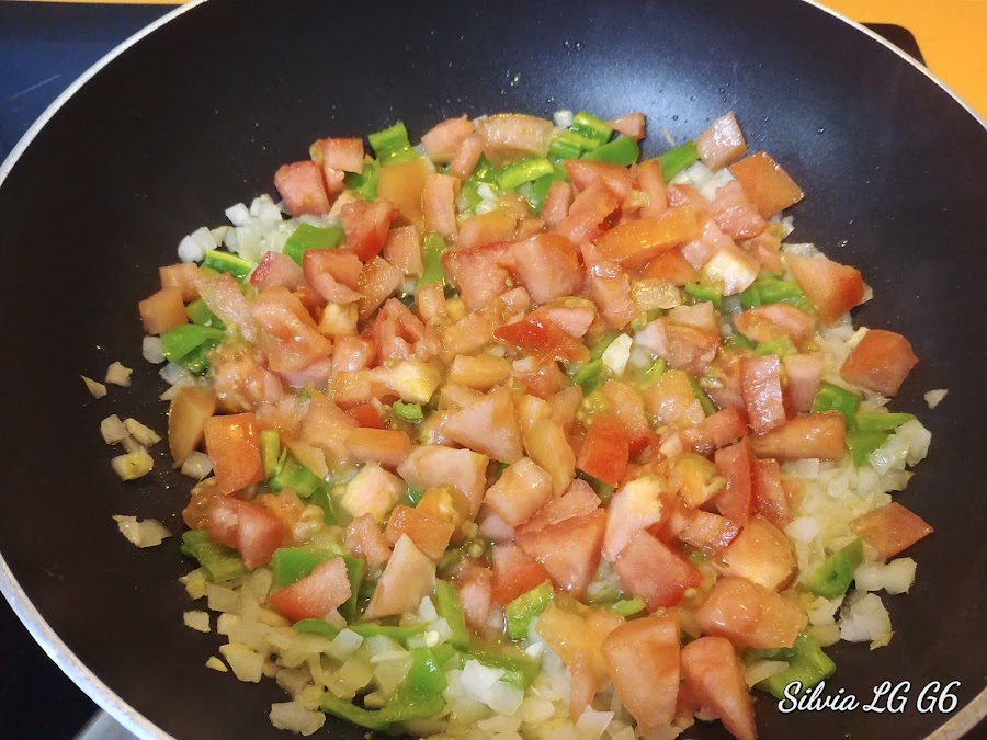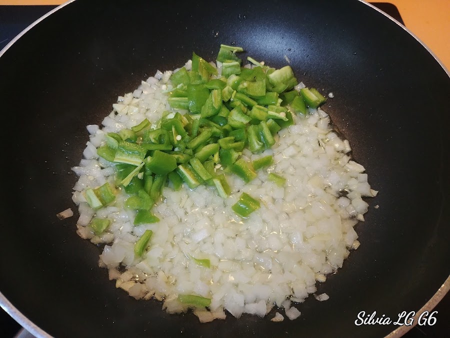 Cuando empiece a ponerse transparente añadimos el pimiento picado también.