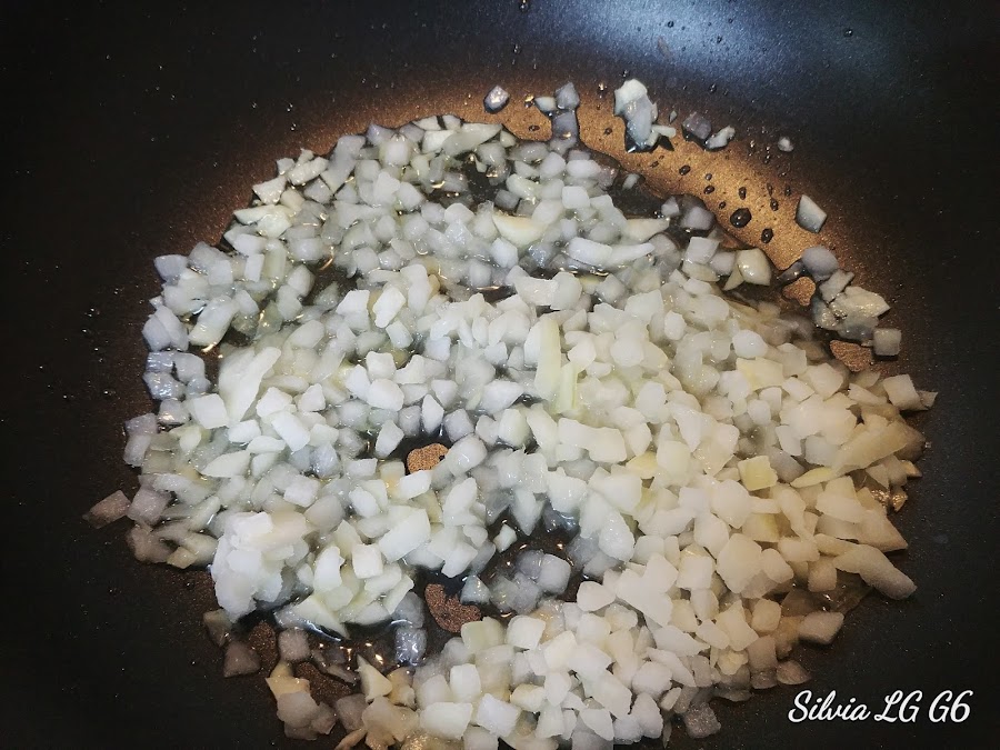En una sartén (yo usé una tipo wok) pochamos la cebolla picadita.
