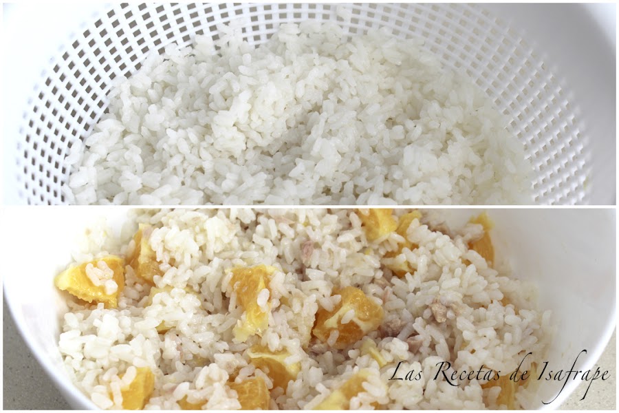 3.-Una vez cocido el arroz, lo volcamos en un escurridor, lo enjuagamos para quitarle el almidón lo y escurrimos bien. Lo ponemos en un bol o ensaladera junto con el atún (escurrimos antes el caldo que pueda tener), la naranja troceada y el aceite de oliva y lo mezclamos. Ya tenemos listo para servir nuestro arroz con naranja y atún. ¡Qué lo disfrutes!