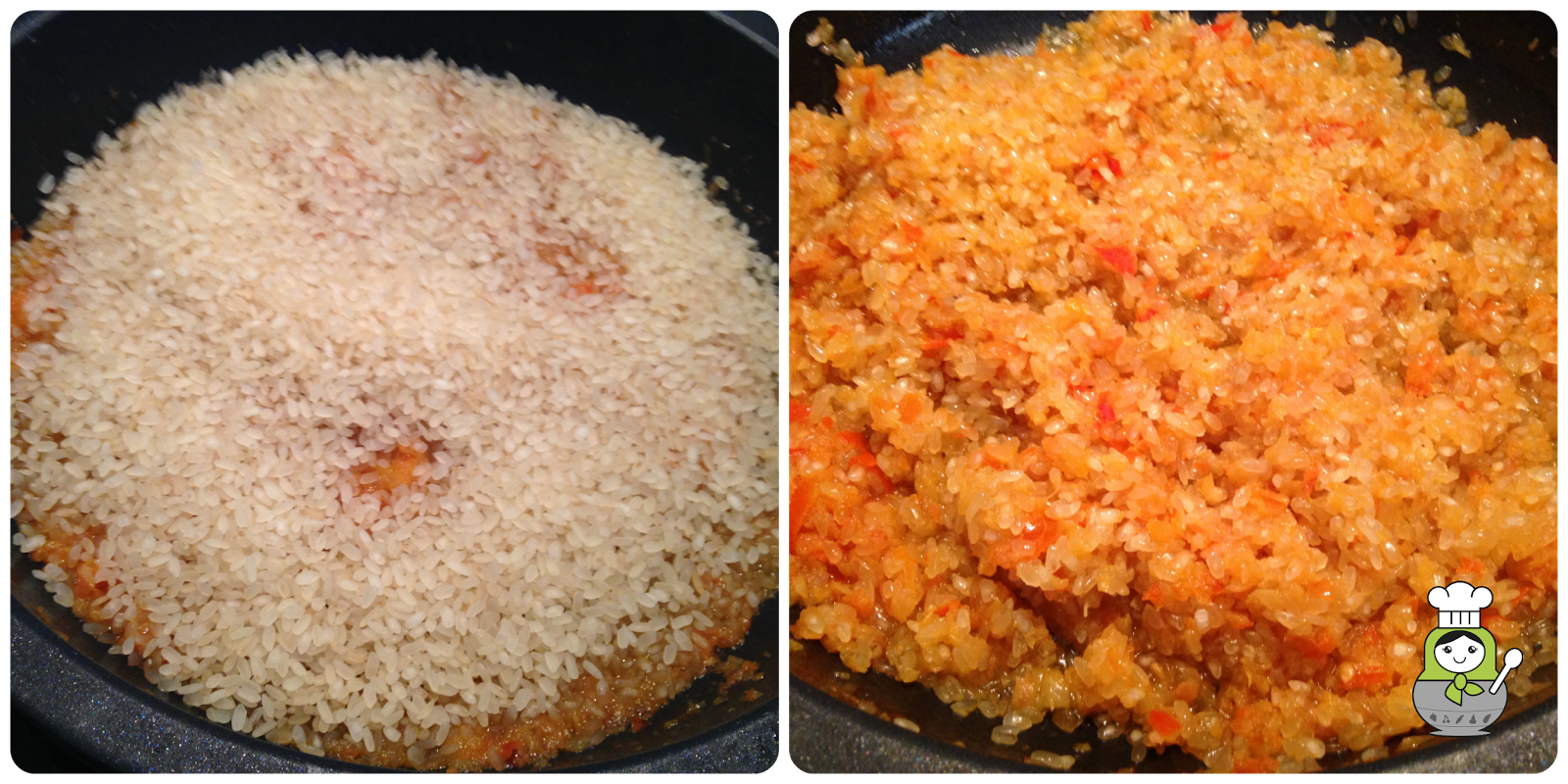 Dejamos que se cocine el sofrito a fuego medio por unos minutos. A continuación, incorporamos el arroz a la paellera y removemos bien todo con una cuchara de madera.