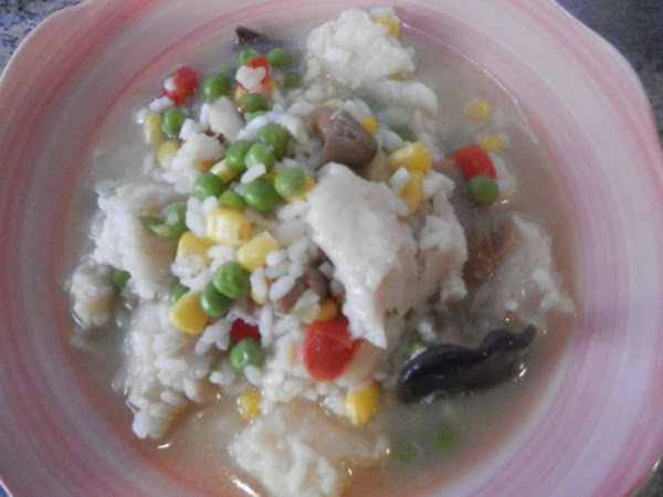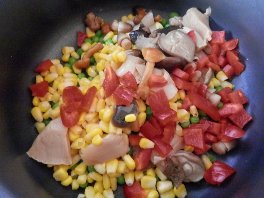 En una cazuela, añadimos la panga, el maíz con el líquido que lo conserva, las setas, escurridas, el pimiento, los guisantes y las puntas de espárragos con su líquido. En este caso, no he añadido los espárragos porque no me quedaban.