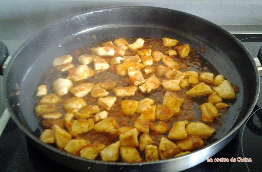Cuando están bien sofritos se sacan y se echa el pollo partido en trocitos, freímos bien y a continuación agregamos los tomates rallados, seguimos sofriendo hasta que el tomate esté bien frito.