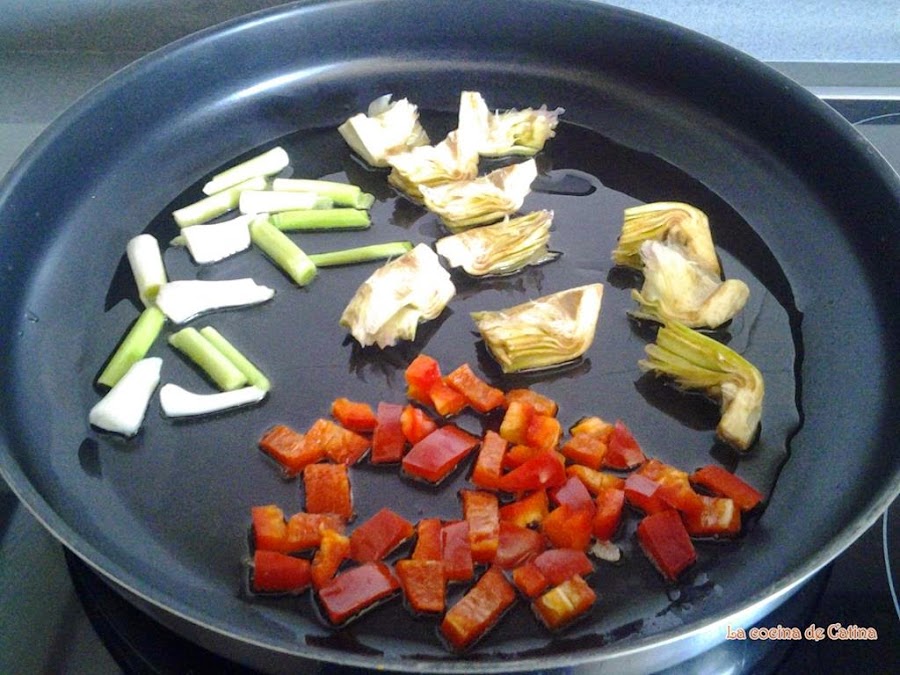 Preparación:Se pone el aceite a calentar en una paellera. Mientras se calienta limpiamos las alcachofas, partimos en cuatro trozos y se lavan con agua y zumo de limón. Escurrimos bien y las echamos a la paellera con los ajos y el pimiento cortados a trocitos.