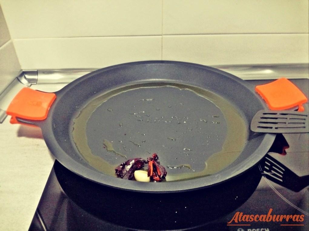 Calentar tres cucharadas de aceite de oliva en una paellera (cuanto más grande mejor, para que el arroz quede en una capa únicamente)