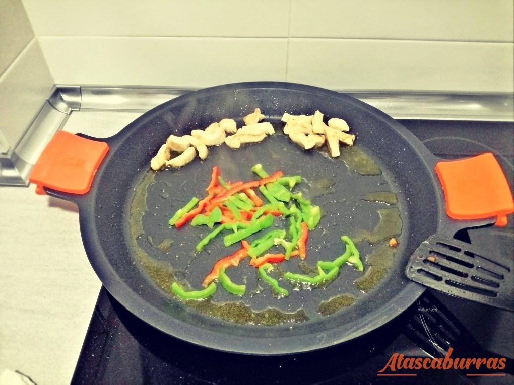 Una vez que esté dorada la pechuga, apartamos por los bordes y añadimos los pimientos troceados