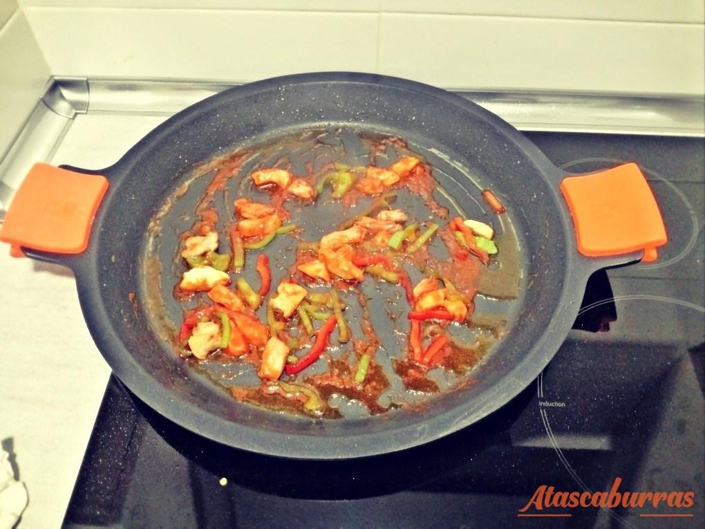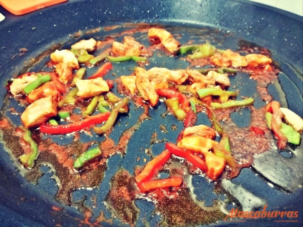 Cuando ya esté con un buen color la pechuga y los pimientos, echamos una cucharada de pimentón de la vera y moverlo rápidamente para que no se queme