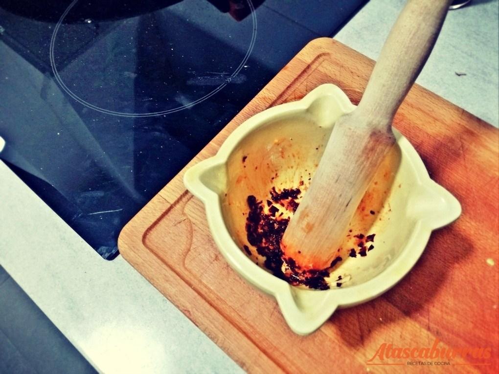 Con el ajo y la ñora que teníamos apartados, se pica bvien en un mortero