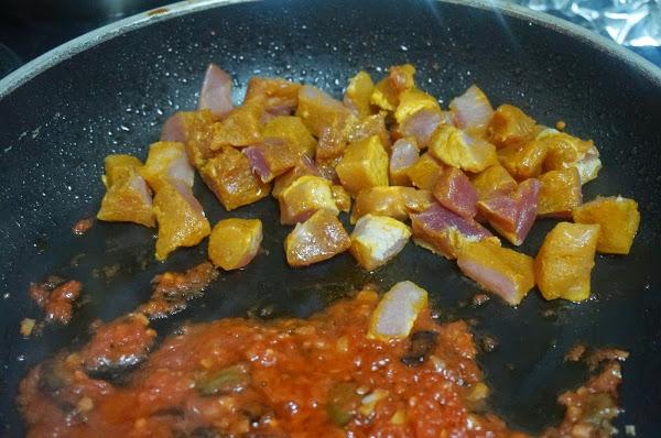 Y antes de que se dore el ajo echaremos el tomate y lo dejaremos cocer 5 minutos.