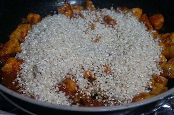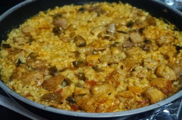 Y echaremos el caldo ya caliente y un poco de colorante y lo dejaremos hasta que esté listo el arroz.