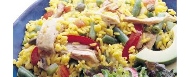 2 cucharadas de aceite de oliva, 2 cebollas medianas cortadas, 6 dientes de ajo picados, 2 tallos de apio cortados, 2 pimentones verdes o rojos cortados en tiras, 1 taza de champiñones picados, 2 tazas de arroz sin cocer, 3 libras de pechuga de pollo deshuesada y sin piel cortadas en trozos pequeños, 1½ cucharadita de sal ,2 tazas de consomé de pollo bajo en grasa, curry para dar color ,3 tomates medianos picados, 1 taza de arvejas congeladas 1 taza de maíz congelado, 1 taza de habichuelas verdes Aceitunas o alcaparras para adornar (opcional)