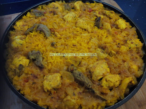 400 gr arroz, 500 gr pollo, un litro caldo de pollo, un tomate, una cebolla, 3 dientes de ajo, una cucharada pimentón dulce, hebras de azafrán, aceite de oliva, pimienta negra molida y sal.