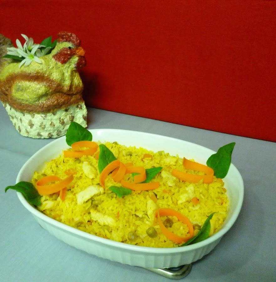 En una sartén grande caliente colocar el aceite y cebolla,chile,apio,ajo dejar cristalizar ya listo agregamos la curcuma,paprika,sal y pimienta aparte del calor y colocar en un pirex rectangular grande,ahora colocar el pollo,petit pois,aceitunas,arroz,salsa de tomate licuada,agua caliente cubrir con papel aluminio y llevar al horno a 350grados f por 30minutos o al ver reventado el arroz,ya listo colocar el culantro picado y sirva.