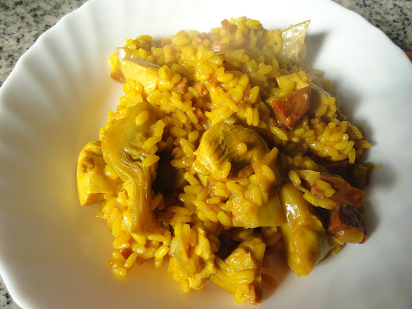 Ponemos a dorar en el aceite los trocitos de pollo, con el chorizo, cuando estén doraditos y el chorizo haya soltado jugo, ponemos los ajos laminados y la cebolla en brunoise, y el pimiento rojo troceado. Dejamos dorar todo muy bien e incorporamos el arroz, damos unas vueltas en seco, ponemos las alcachofas y el caldo caliente. Dejemos cocer hasta que el arroz esté tierno. Es un arroz diferente, con un sabor muy rico y que se prepara en un santiamén.