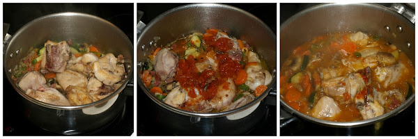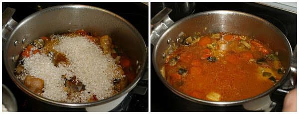 - Es el momento de incorporar el pollo, un poco de sofrito de tomate y agua, sin llegar a cubrirlo del todo (en este paso podríamos parar la cocción si lo preparamos con antelación y echar el arroz más tarde, poco antes de comer) Dejamos que hierva, bajamos un poco el fuego y cocinamos unos minutos, sin llegar a hacerlo del todo.