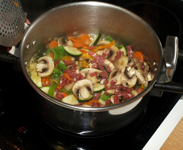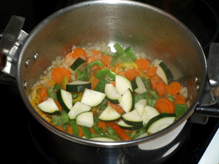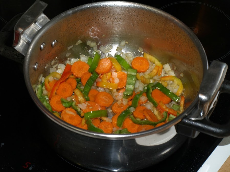- Cuando empiece a estar blandita añadimos el pimiento y la zanahoria. Damos una vuelta y dejamos que cocine hasta que se también se ablanden un poco.