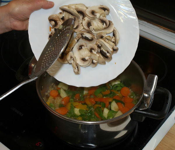 - Lo primero de todo es preparar las verduras: picamos la cebolla y el ajo, cortamos en tiras el pimiento, en rodajas la zanahoria, el y los champiñones. Reservamos y ponemos a dorar el pollo, previamente salado, en la olla con un poco de aceite. Cuando esté listo lo colocamos en un palto y reservamos.