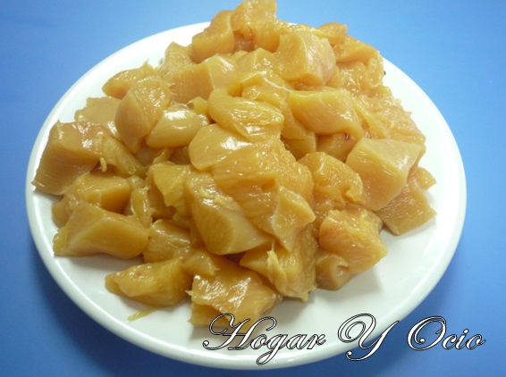 ELABORACIÓN:1. Quitamos la piel y la grasa visible a las pechugas si es que la tienen. A continuación, las cortamos en dados grandes.