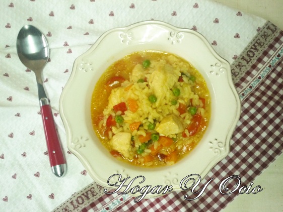 5. Cuando las verduras estén ya bastante hechas (veréis que el tomate se comienza a deshacer), es momento de agregar el arroz. Le damos unas vueltas y añadimos también la pechuga que teníamos reservada.