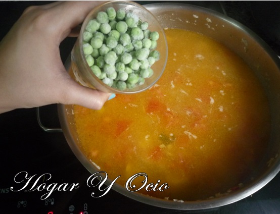 7. Añadimos los guisantes y condimentamos con el azafrán y la sal.
