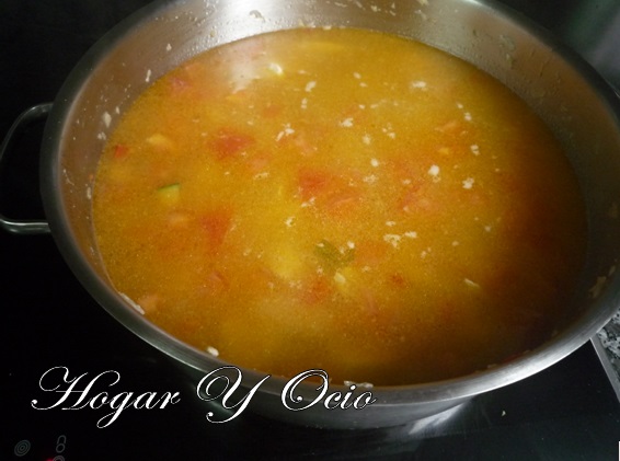 6. Inmediatamente incorporamos el caldo (mejor que sea hecho en casa). En este tipo de guisos suelo poner cuatro partes de caldo por una de arroz, necesitaréis unos dos litros.