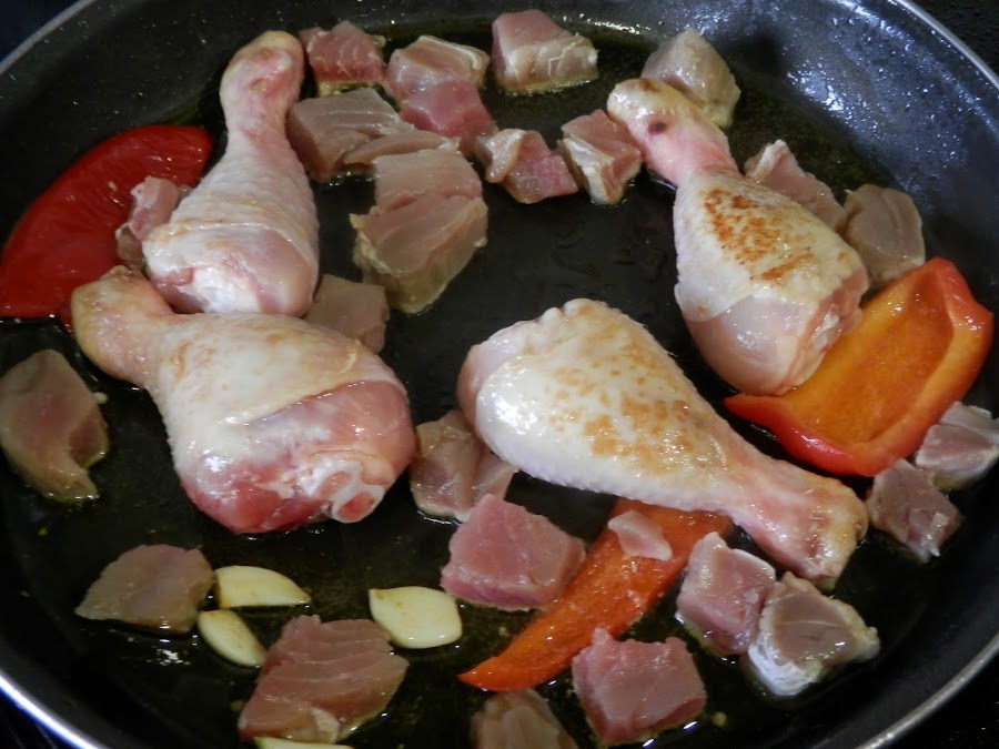 Cuando lo tengas medio hechito y los ajos estén dorados, sácalos y añade los muslitos de pollo.