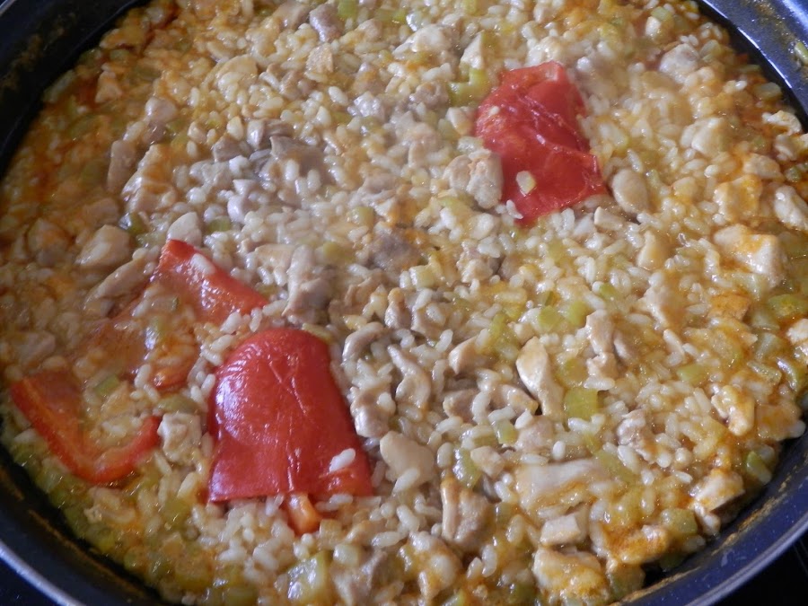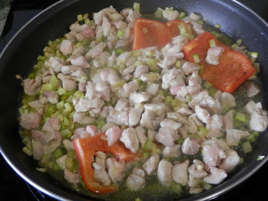 Cuando todo esté cocinado, añade caldo de pollo (si tienes) o en su defecto, agua.