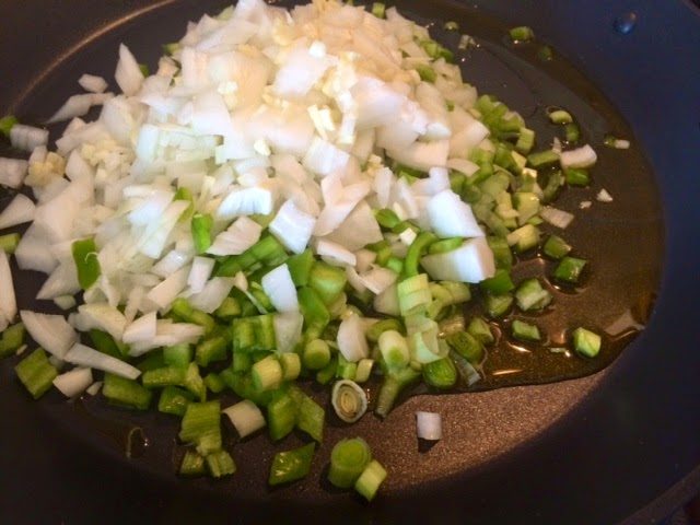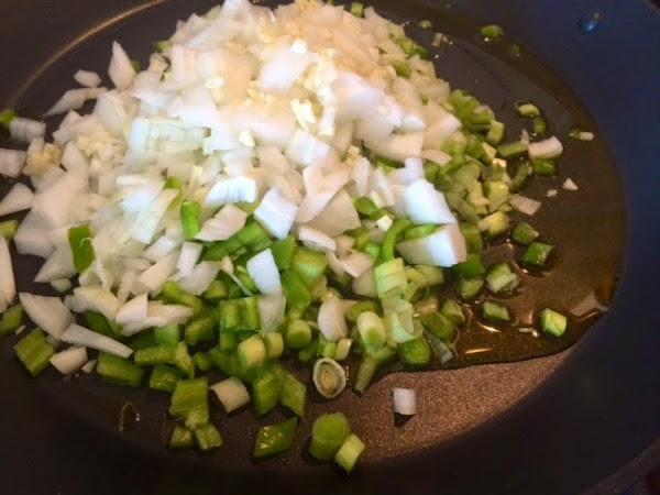 Poner el aceite en la paellera a calentar y echar la cebolla y el pimiento verde cortados en cuadraditos y los ajos tiernos en rodajas. Pochar a fuego medio 5 minutos.