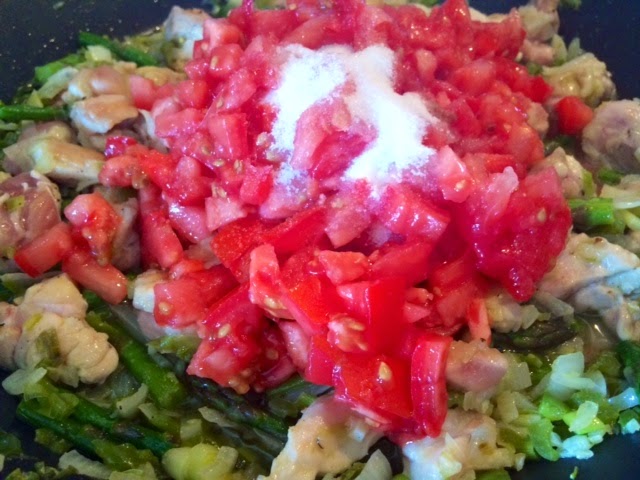 Mientras se pocha, trocear los tomates (pelarlos previamente) y añadirlos a la paellera. Echar una cucharada de azúcar para la acidez y un poco de sal.
