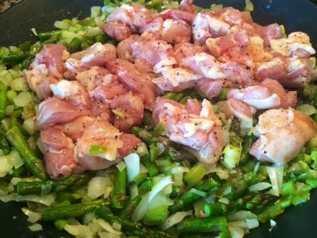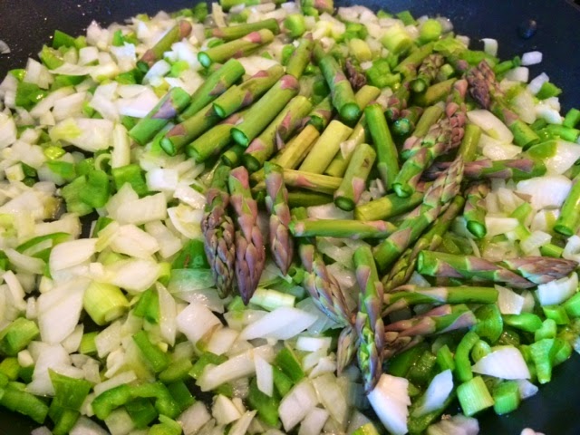 Desechar el tallo de los espárragos y cortar el resto en 3 trozos y añadir a la paellera.