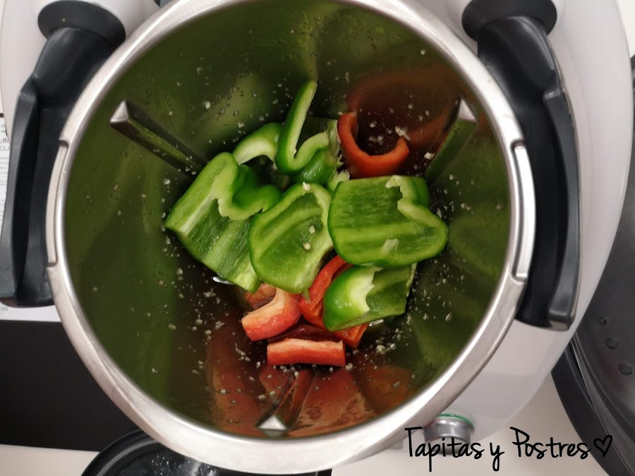 Añadimos las dos clases de pimientos y troceamos 5 segundos a velocidad 5. Sofreímos 8 minutos, temperatura varoma, giro a la izquierda y velocidad cuchara.