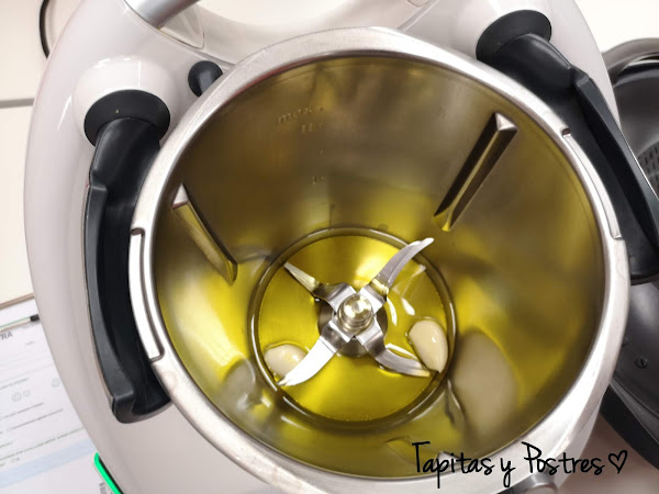 Ponemos en el vaso los ajos y el aceite y troceamos 5 segundos a velocidad 6.
