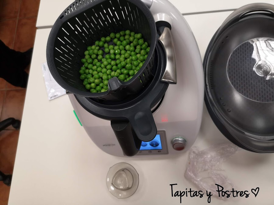 Y mientras se cocina, con el vapor vamos haciendo los guisantes. Dos minutos antes de acabar los agregamos por el bocal. Al acabar, dejamos reposar.