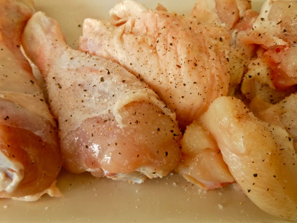 A continuación salpimenta con sal fina y pimienta negra molida los trozos de pollo.