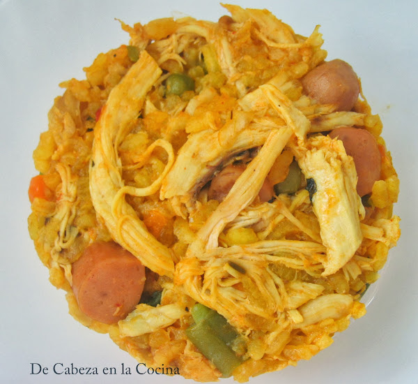 Aparte, poner al fuego un recipiente con 2 cucharadas grandes de aceite, cuando caliente agregar el pimiento finamente picado, la cebolla y esperar unos 4-5 minutos cuando les falte muy poco para que se hagan agregar los dos ajos finamente picados, agregar las verduras, echar el arroz, la cayena, revolver muy bien, agregar 3 tazas del caldo que habíamos reservado, la cayena, ajustar la sal, bajar el fuego y tapar, a los 7-10 minutos, cuando aun quede un poco de caldo, agregar el tomate frito, el pollo desmechado (y en mi caso los guisantes por que eran de lata).