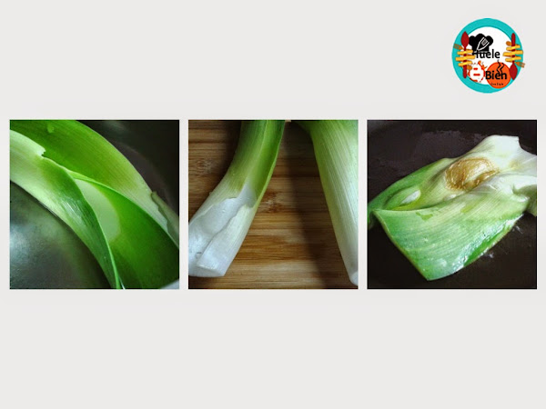 REALIZACIÓN1.- Lavamos el puerro, reservamos 1 capa del tallo por persona. La vamos bien en agua y reservamos. Picamos el resto del puerro, en una paellera ponemos un poco de aceite de oliva, rehogamos el puerro unos minutos. Pelamos la cebolla, la picamos y la rehogamos también, después de 5 minutos añadimos el ajo pelado y picado.