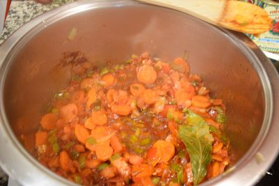 Cuando comiencen a ponerse tiernos, añade las zanahorias peladas y cortadas en rodajas.