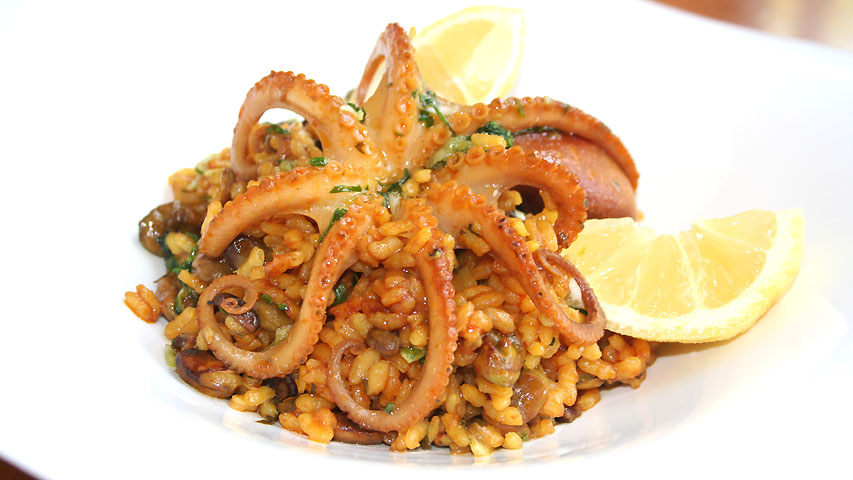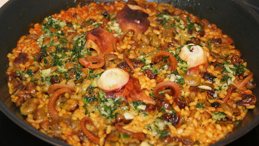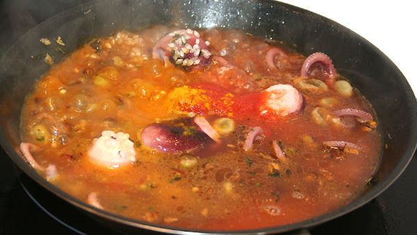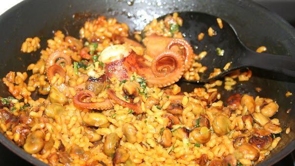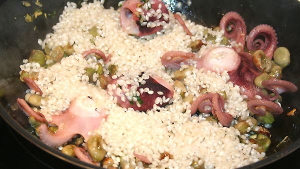 Sobre un poco del majado añade los pulpos, las habas y el arroz bomba (100 gr por persona).