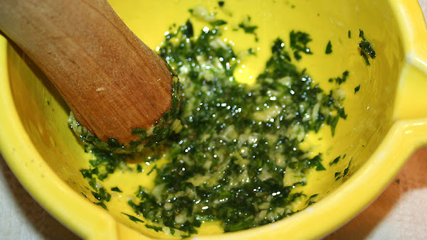 Prepara un majado en el mortero con los ajos, un poco de sal gruesa y un poco de perejil picado. Añade sal, pimienta molida, ralladura de piel de limón y aceite de oliva. Reserva.