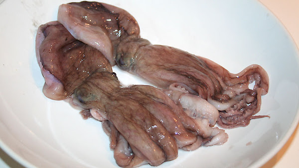 Los pulpitos una vez cocidos los sumerjo en agua fría, los enfrío y les limpio los tentáculos. Después les quito la zona de los ojos.
