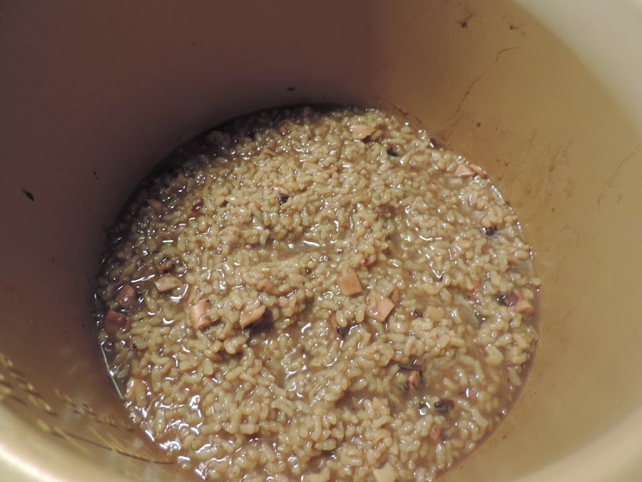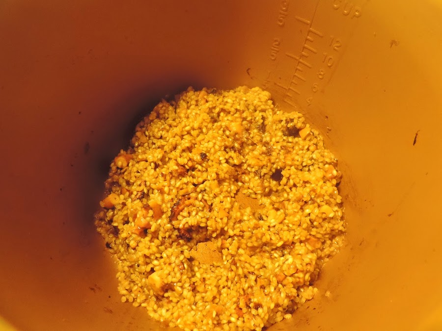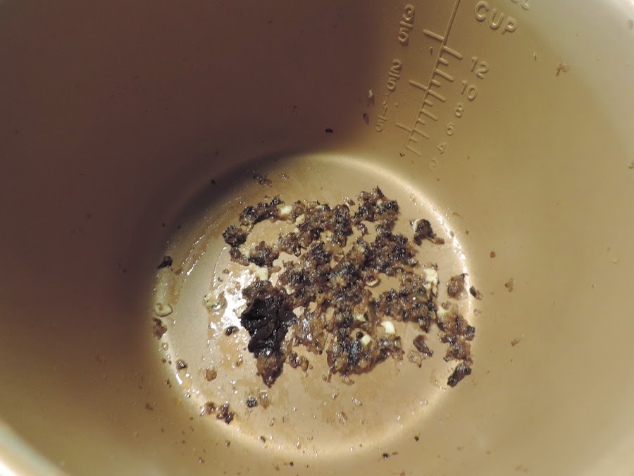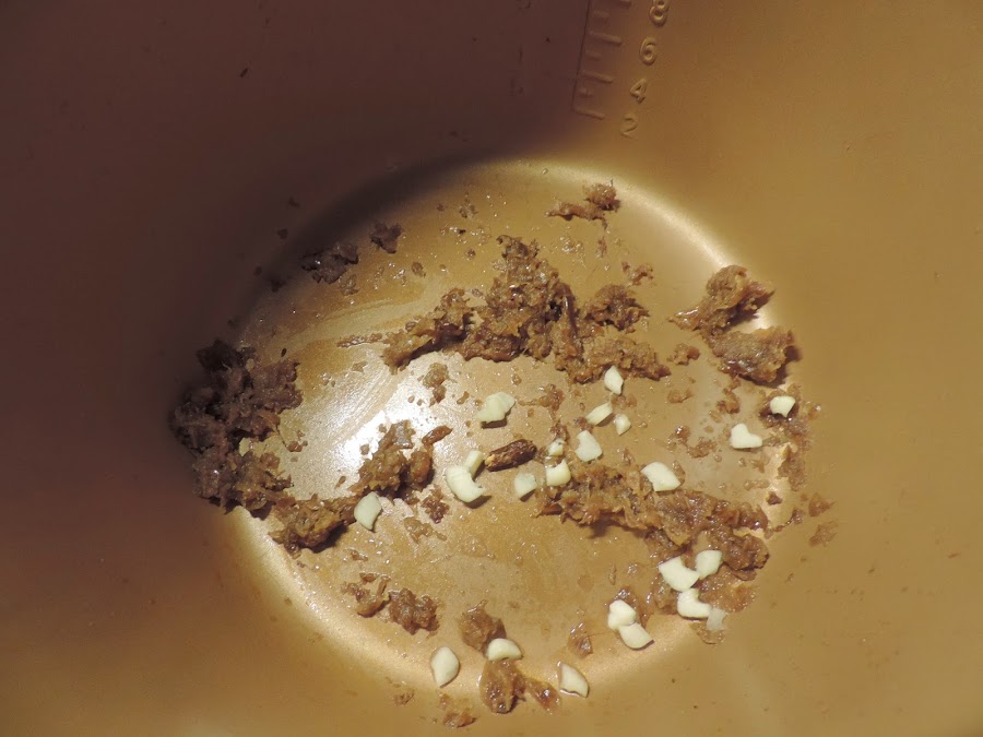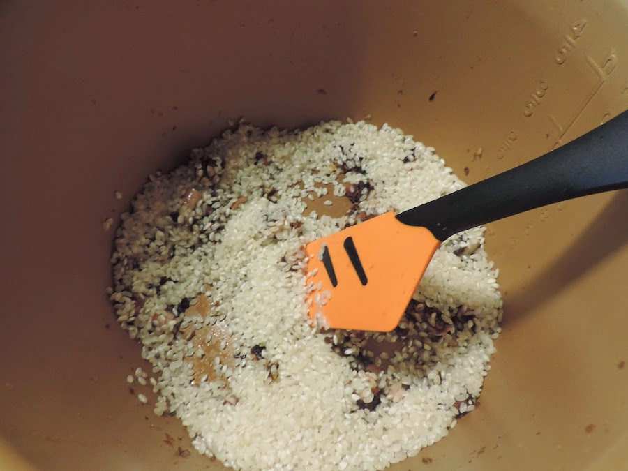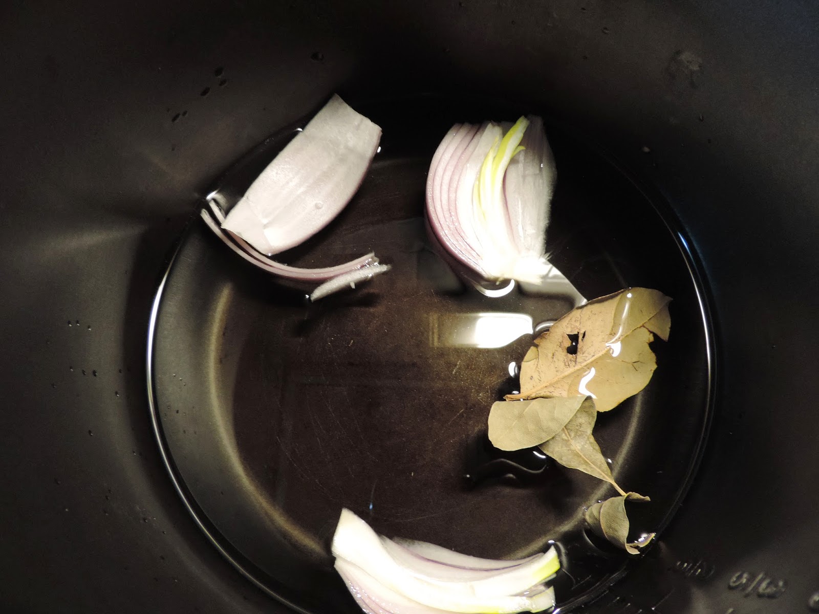 Ponemos las 2 cucharadas de aceite de oliva con la cebolla picada en la cubeta de la olla.
