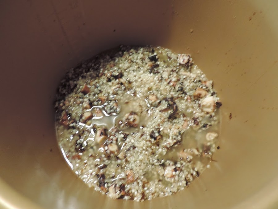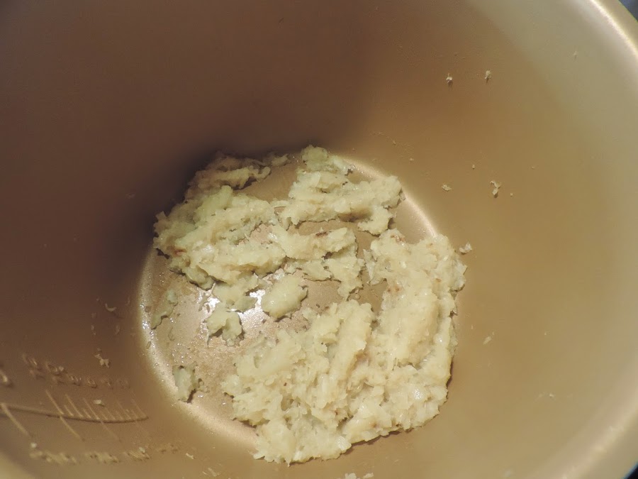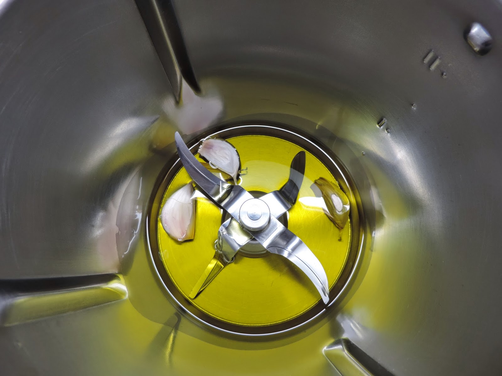 Para preparar la ajada poner el aceite de oliva y los ajos en el vaso del thermomix, programamos 12 minutos, 90º, velocidad cuchara, giro a la izquierda. Dejamos reposar para que baje de temperatura.