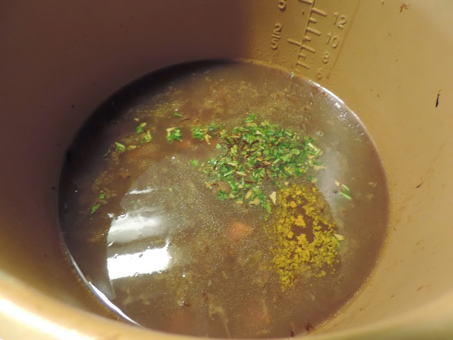 Echamos el caldo caliente, perejil, laurel picados y la cúrcuma.
