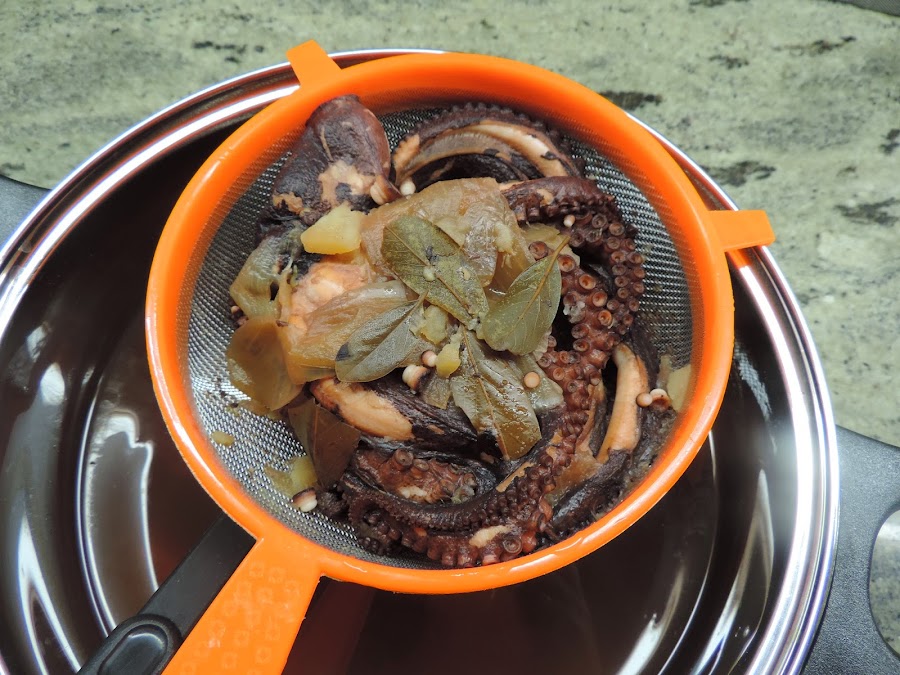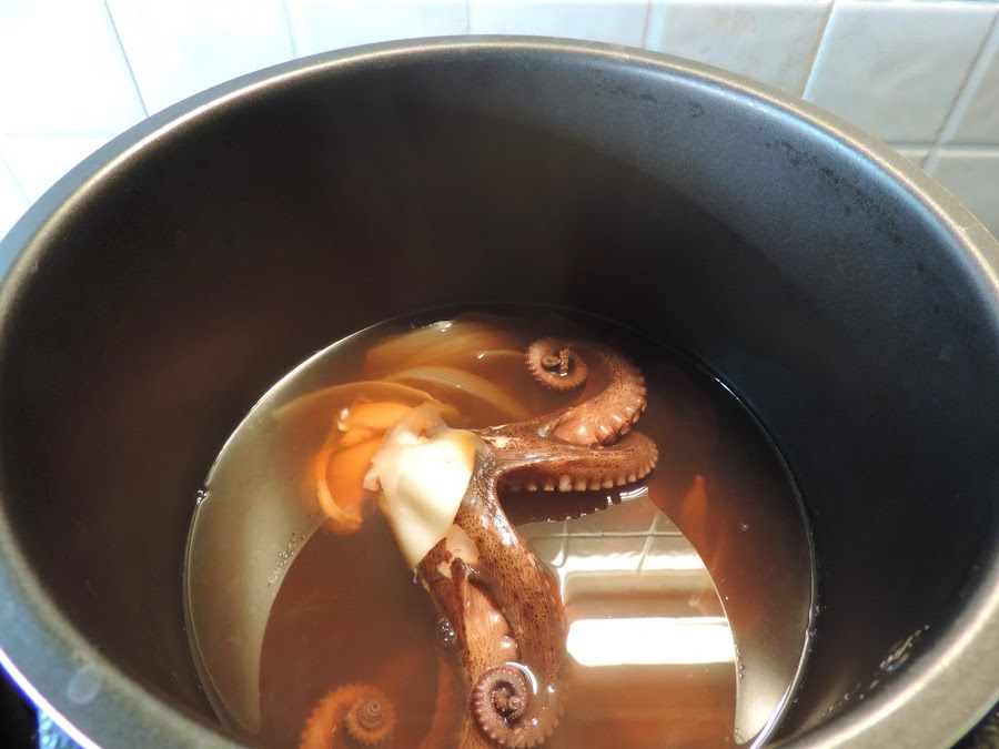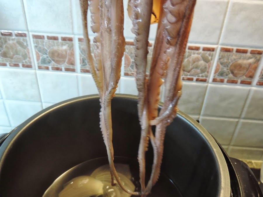 Cortamos la cabeza y las patas del pulpo, dejaremos 1 entera para decorar.