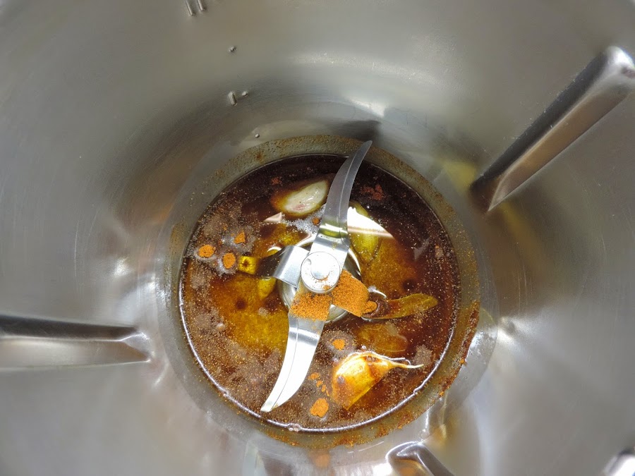 Programamos el thermomix, velocidad 10, y por el vocal echamos el perejil y el laurel para que se piquen.