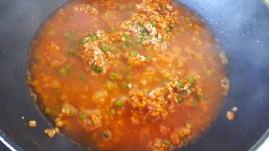 Cuando la cebolla esté doradita añadiremos 2-3 cucharadas de tomate frito y dejaremos unos 5 minutos a fuego bajo.