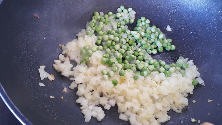 A continuación, en la misma sartén, pocharemos la media cebolla picada. A media cocción le añadiremos los guisantes.