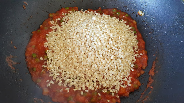 Pasado ese tiempo añadiremos el arroz y lo saltearemos junto con el tomate un par de minutos a fuego medio-alto.